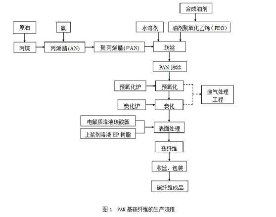 PAN基碳纖維的炭化收率比粘膠纖維高,可達(dá)45%以上,而且因?yàn)樯a(chǎn)流程,溶劑回收,三廢處理等方面都比粘膠纖維簡(jiǎn)單,成本低,原料來(lái)源豐富,加上聚丙烯腈基碳纖維的力學(xué)性能,尤其是抗拉強(qiáng)度,抗拉模量等為三種碳纖維之首。所以是目前應(yīng)用領(lǐng)域最廣,產(chǎn)量也最大的一種碳纖維。PAN基碳纖維生產(chǎn)的流程圖如圖1所示。